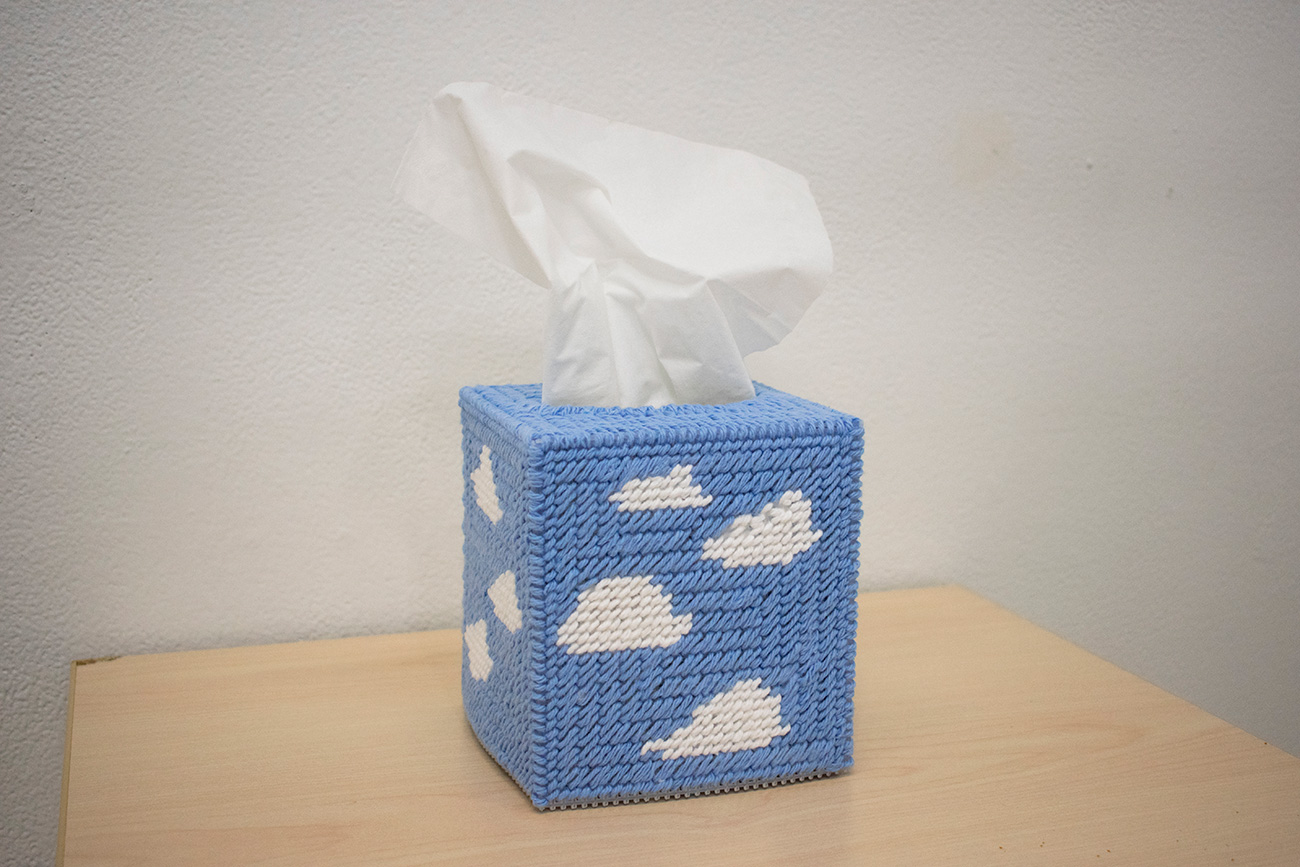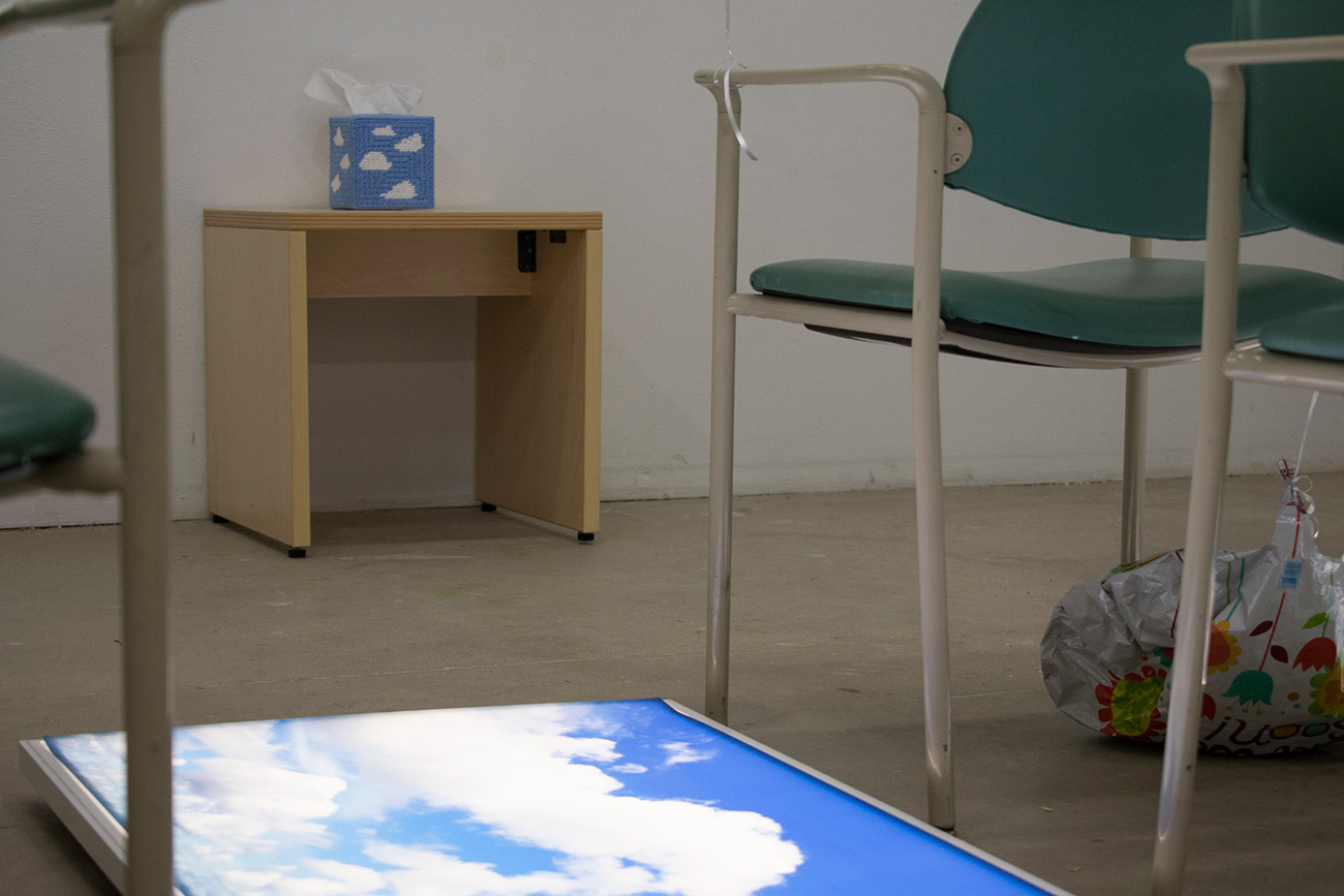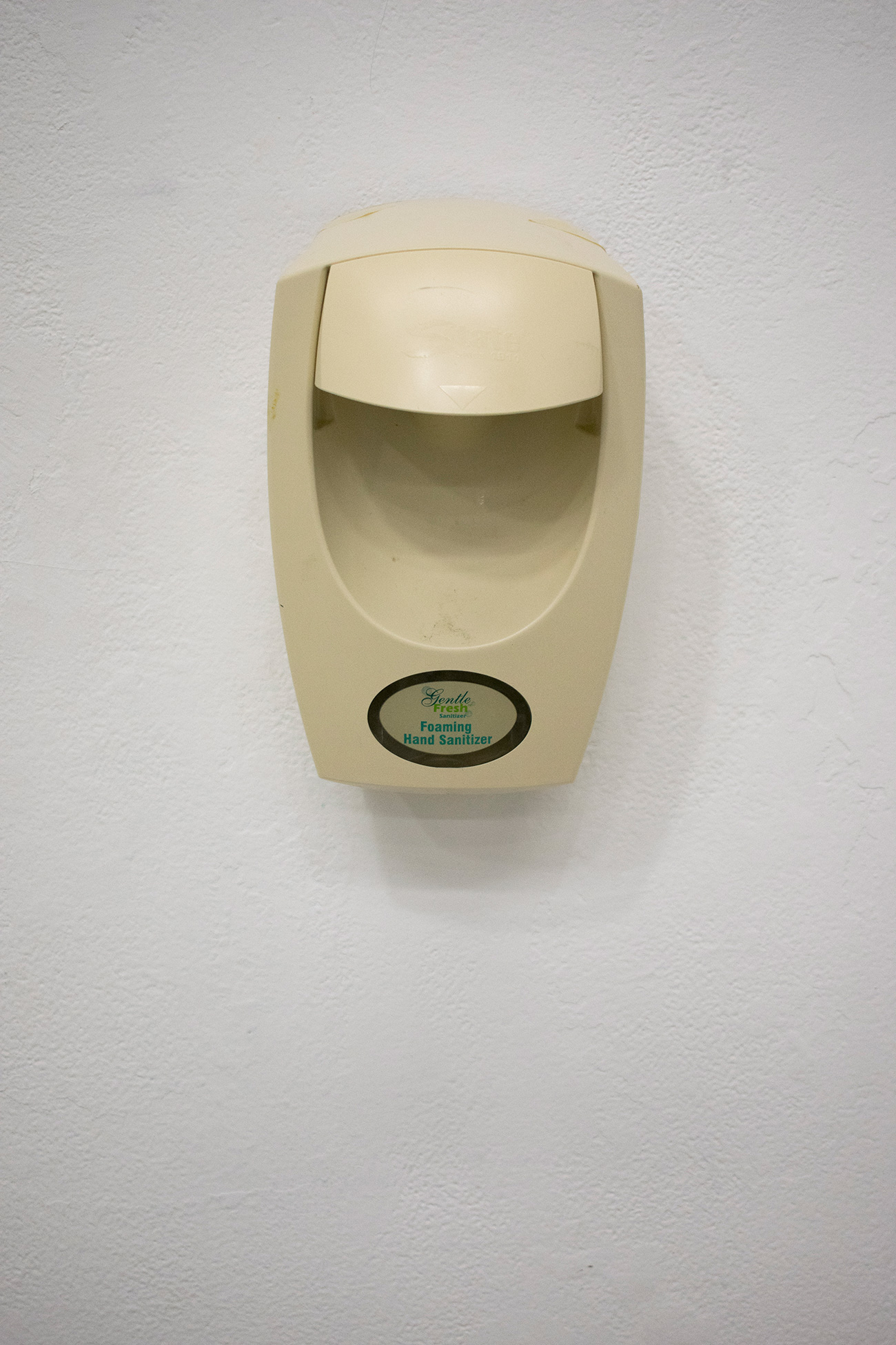 Light covers are attempts to hide unpleasant fixtures in clinical space while manufacturing an artificial connection to the natural world. Homemade tissue box covers are also decorative facades that hope to beautify or comfort but provide no other functional purpose. An empty hand sanitizer dispenser hanging on the wall becomes a metaphor for sterilization in interpersonal exchange, since language can work as a façade to cover or ignore unpleasantness or pain.