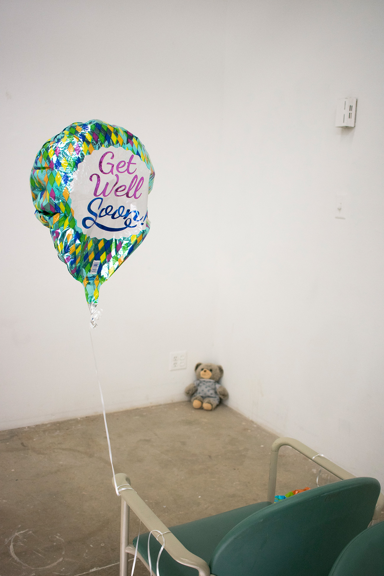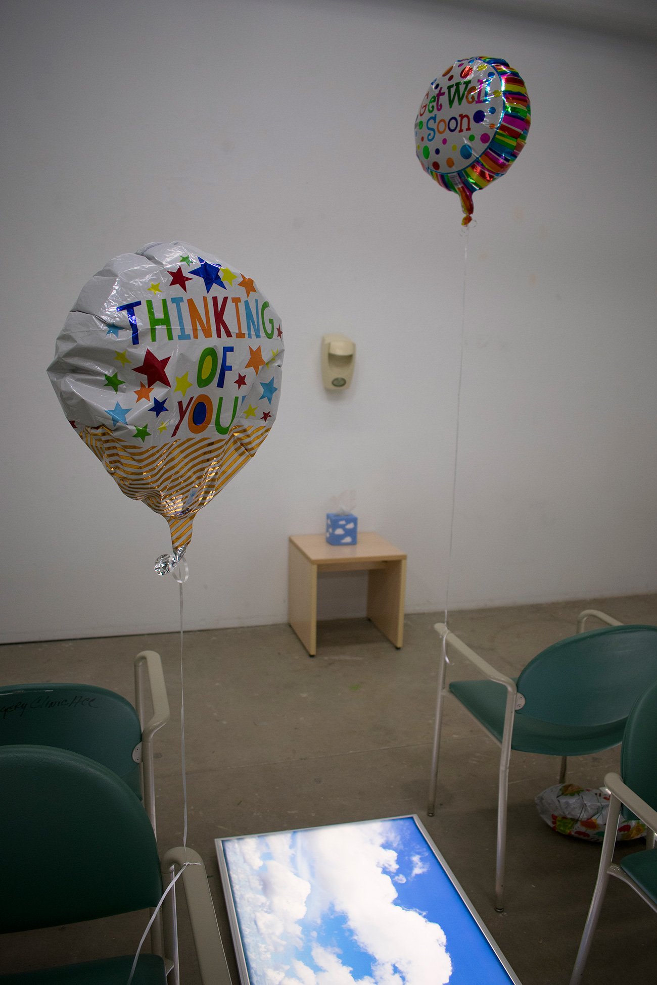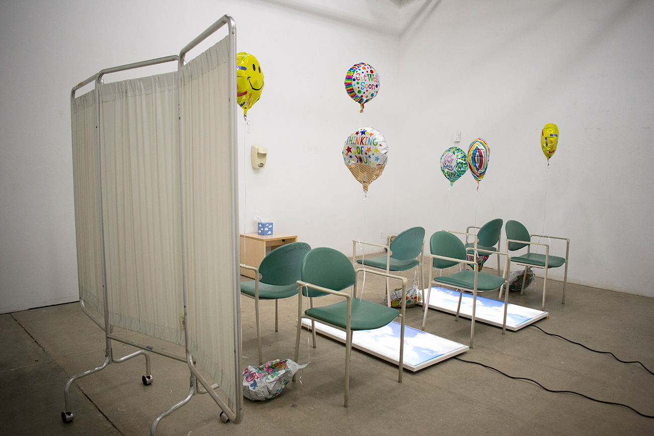 waiting room chairs and table, mylar balloons, hand sanitizer dispenser, troffer lights, manufactured light covers, stuffed bear, hospital gown, yarn, plastic canvas, tissue box, hospital partition