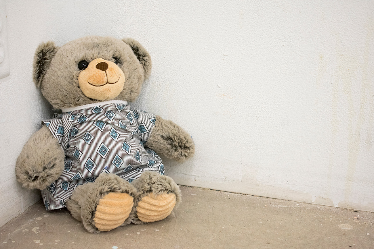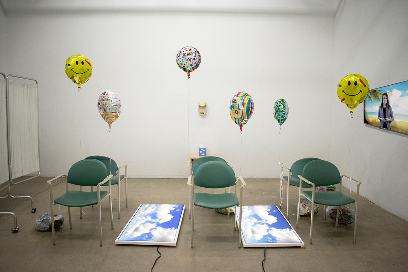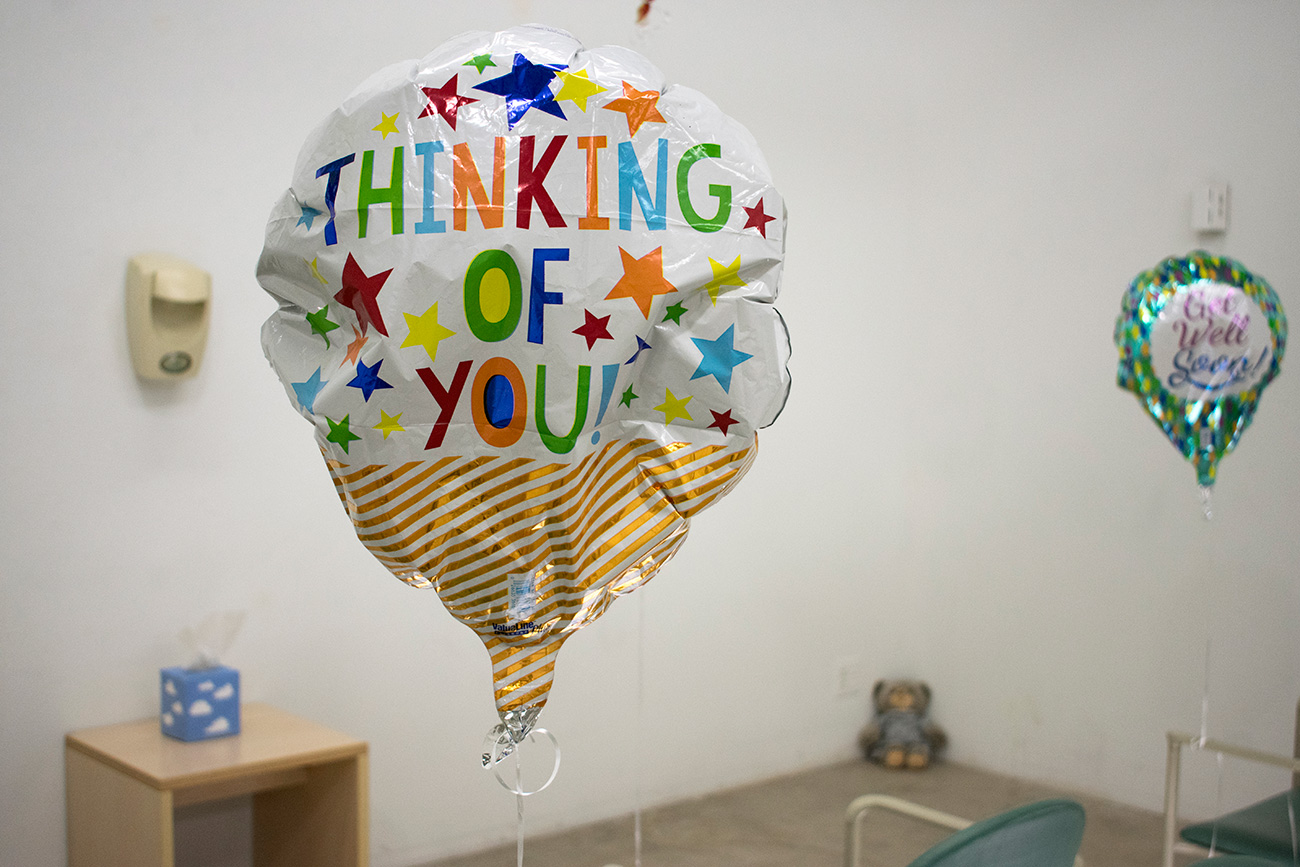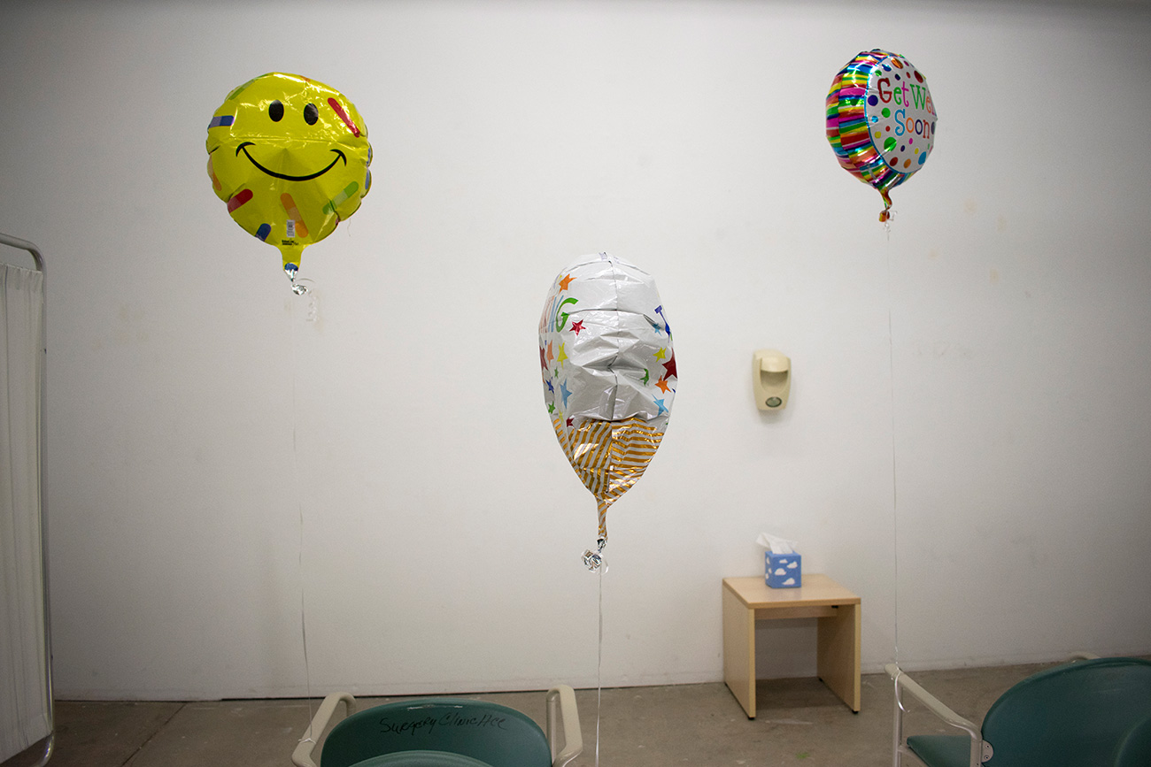 waiting room chairs and table, mylar balloons, hand sanitizer dispenser, troffer lights, manufactured light covers, stuffed bear, hospital gown, yarn, plastic canvas, tissue box, hospital partition
