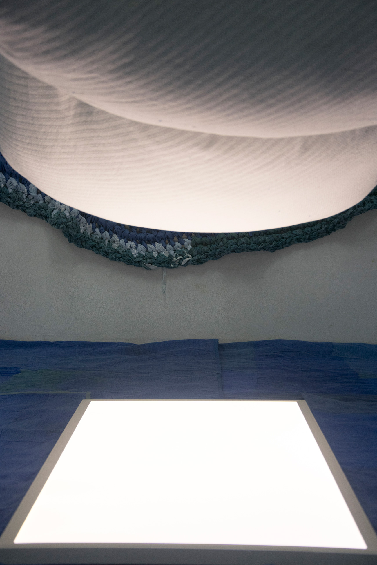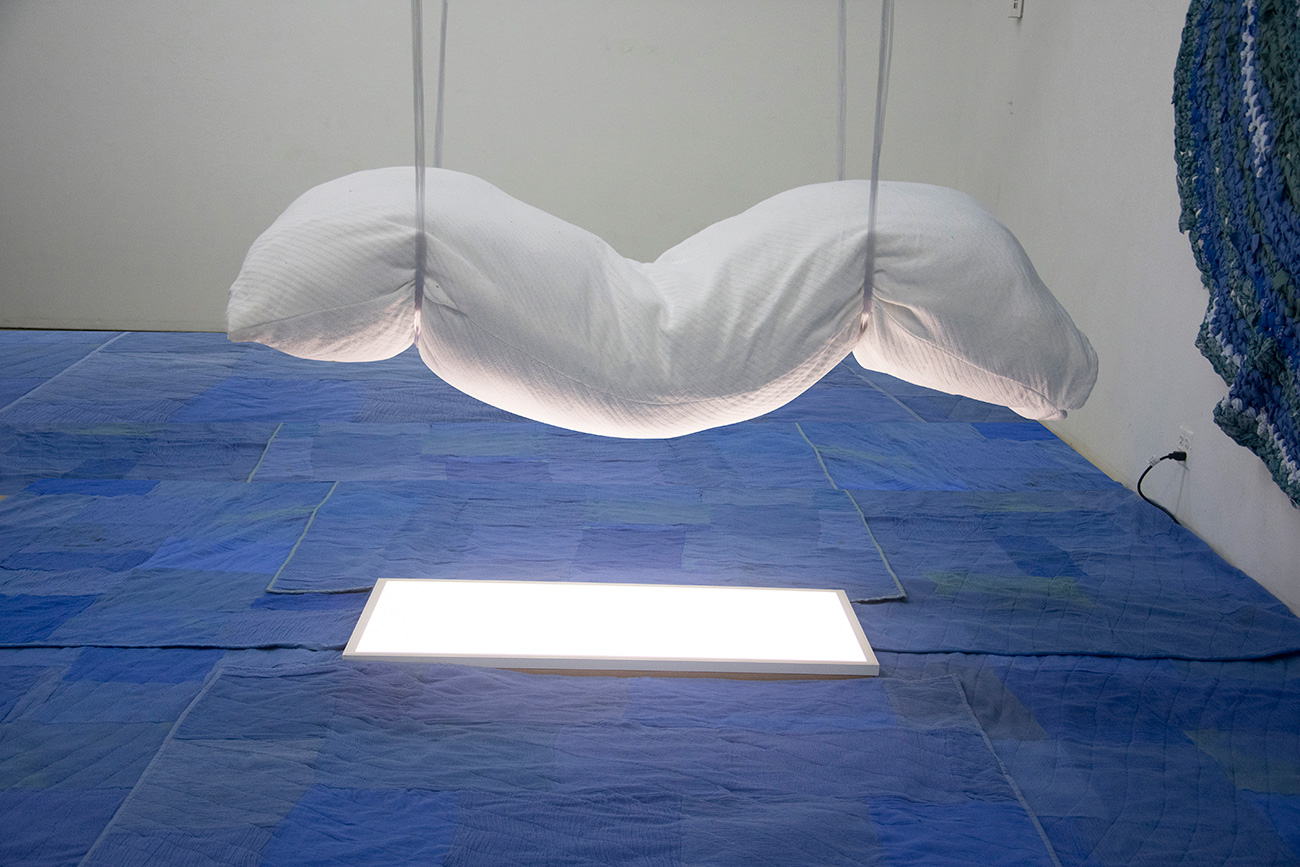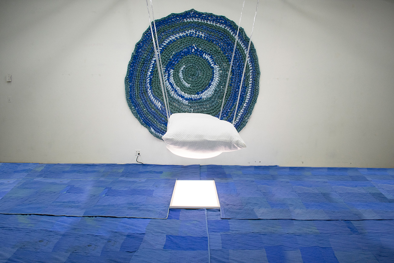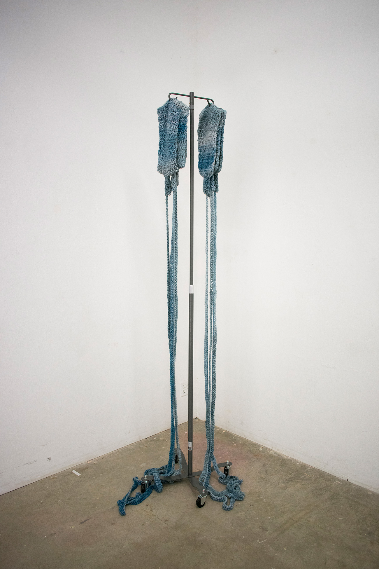 Framing the hospital room as sacred space, this work explores fiber crafts like rug-making and quilting using textiles from clinical settings. As beds and pillows are vessels for holding the body, so are quilts, rugs, towels, gowns, socks, and sheets. Viewers are invited to remove their shoes, gather close to objects, and be enveloped in the space. Removing shoes becomes an invitation to vulnerability. To do so in the midst of clinical materials is to treat them differently than we do in biomedicine. We uncover the body rather than covering it for protection; we remove barriers rather than constructing them. In the midst of COVID-19, this is unimaginable. Code Blue, then, becomes a vision of what is impossible and a way to hold the pain of clinical space in care and hope.